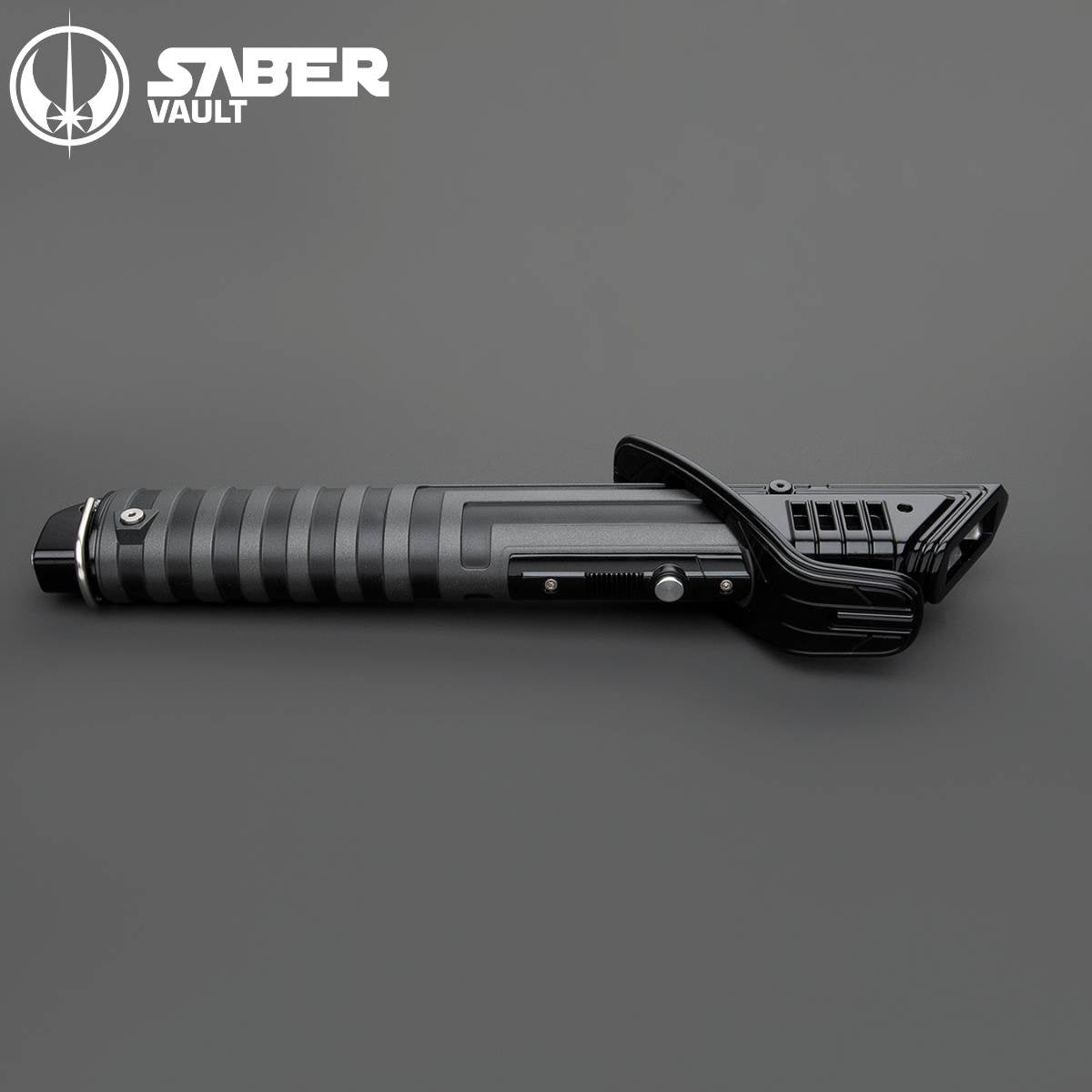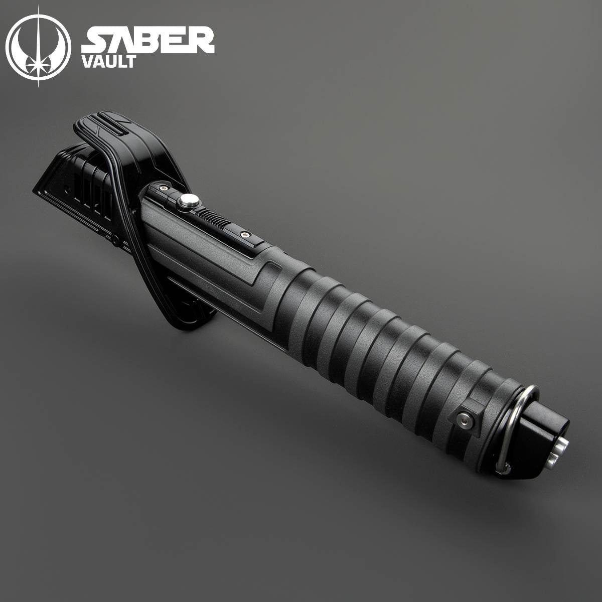 The Dark Saber is inspired by the ancient, black-bladed Lightsaber. Unlike most other lightsabers, the Dark Saber's blade Is flat, , and tapered to a point more typical of a traditional metallic sword. When ignited, the black core of the blade appears to draw in all surrounding light and color, leaving a faint white, electrical aura along its edges. This Saber has a long sleek textured grip, designed for a two handed style of wielding. Its silver and dark matte two-tone finish compliments its design. The knurled body and emitter choke provide excellent grip and spin points. A truly striking and unique Saber. The Saber comes pre-installed with the DarkSaber sound font. This is the way...